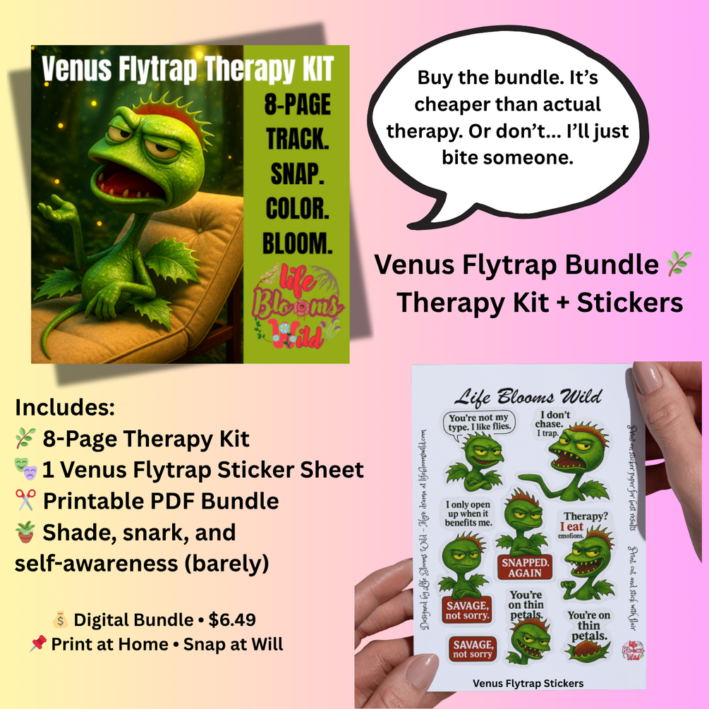 You’ll get an 8-page printable therapy journal featuring Venus Flytrap mood trackers, plant-inspired prompts, and a coloring page with attitude. You’ll get a one-page printable PDF packed with savage Venus Flytrap stickers for journals, planners, and emotional boundary-setting.