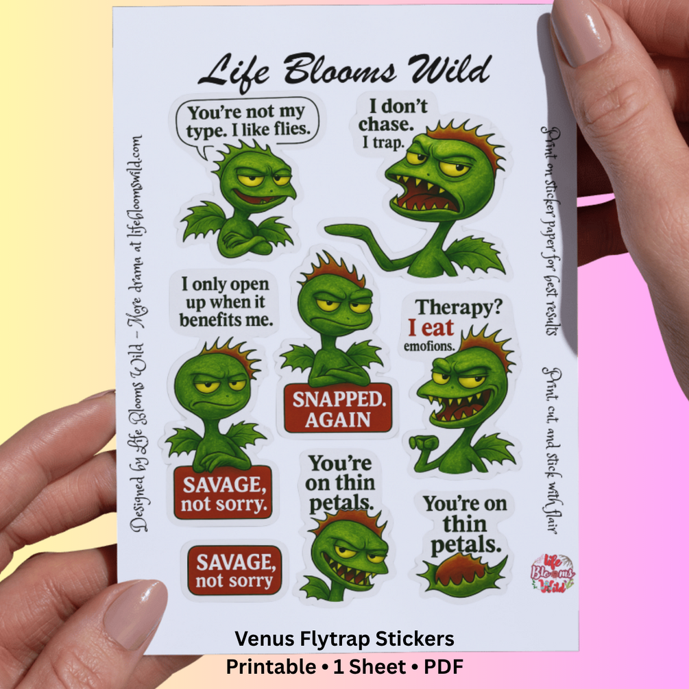 You’ll get a one-page printable PDF packed with savage Venus Flytrap stickers for journals, planners, and emotional boundary-setting.